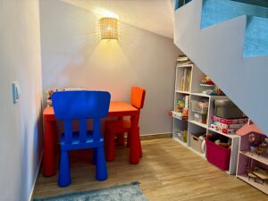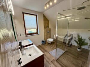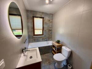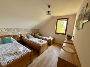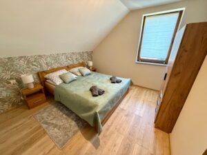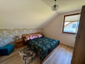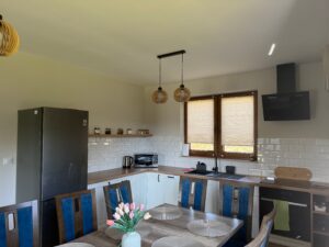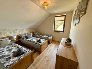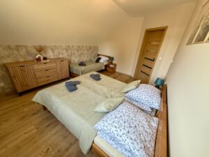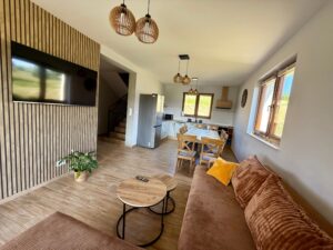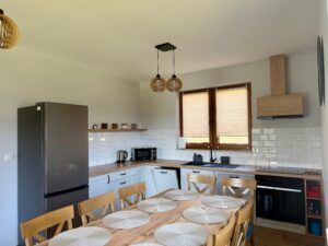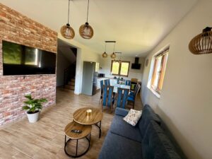 Przytulny domek z dwoma łazienkami, aneksem kuchennym połączonym z salonem. Domek posiada trzy pokoje - dwa trzyosobowe i jeden z podwójnym łóżkiem - mieści 10 osób